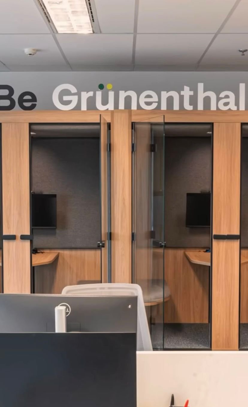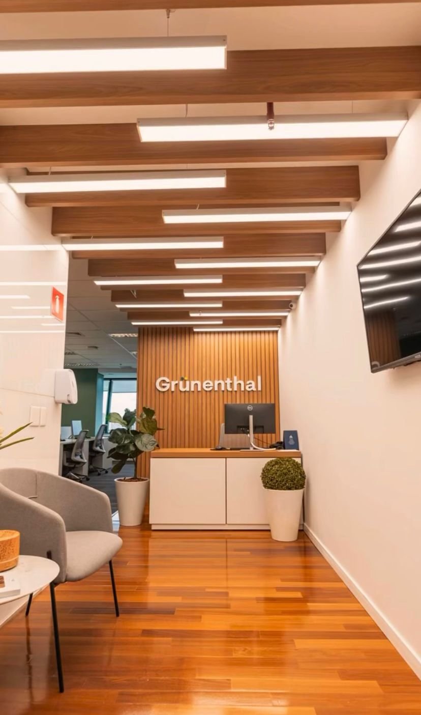 A Look Display (antiga InstantShop) foi responsável pela fabricação e fornecimento dos mobiliários sob medida para a sede corporativa da Grünenthal no Brooklin. O projeto foi executado conforme detalhamento técnico da equipe de arquitetura da empresa e contemplou estações de trabalho com ergonomia corporativa e identidade visual limpa, cabines acústicas individuais com fechamento em vidro e estrutura amadeirada, balcão de recepção com painel ripado e integração de marca, além de apoios em áreas de espera e circulação.