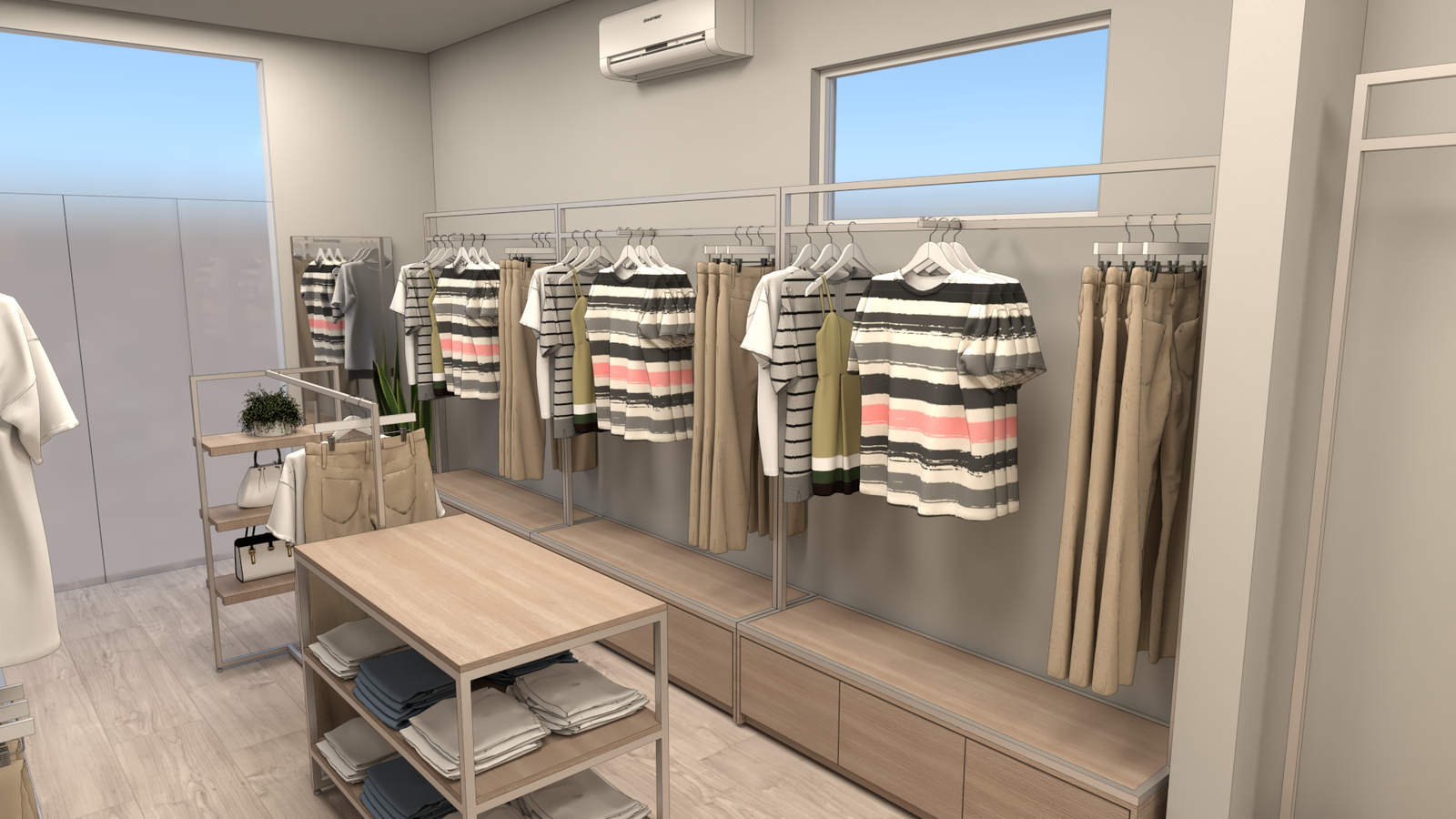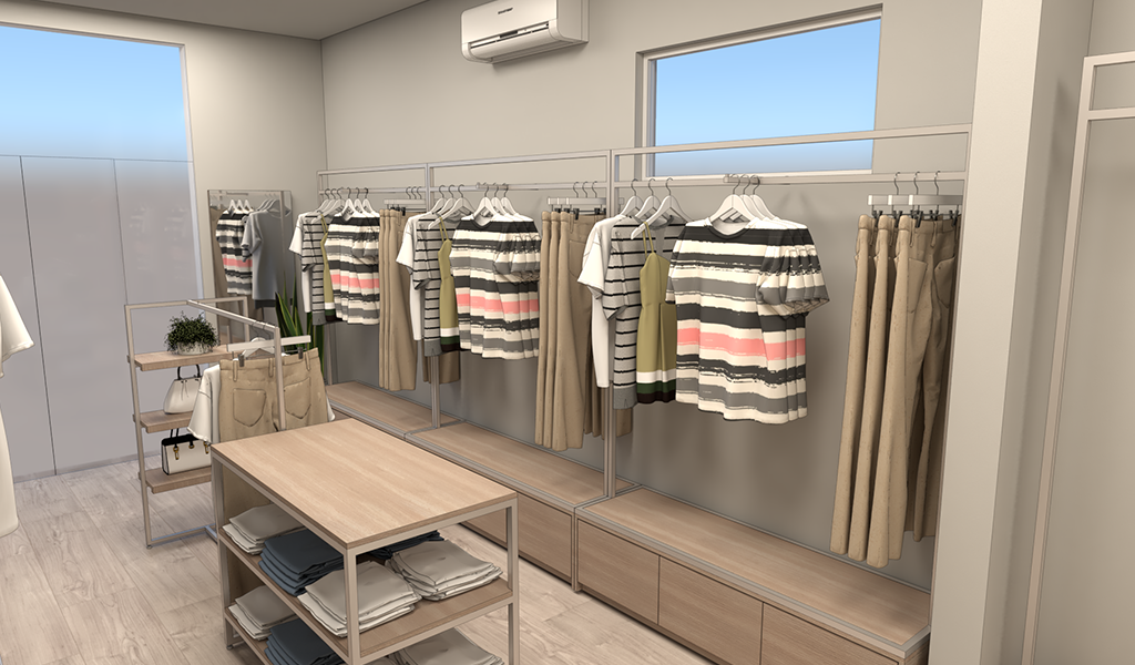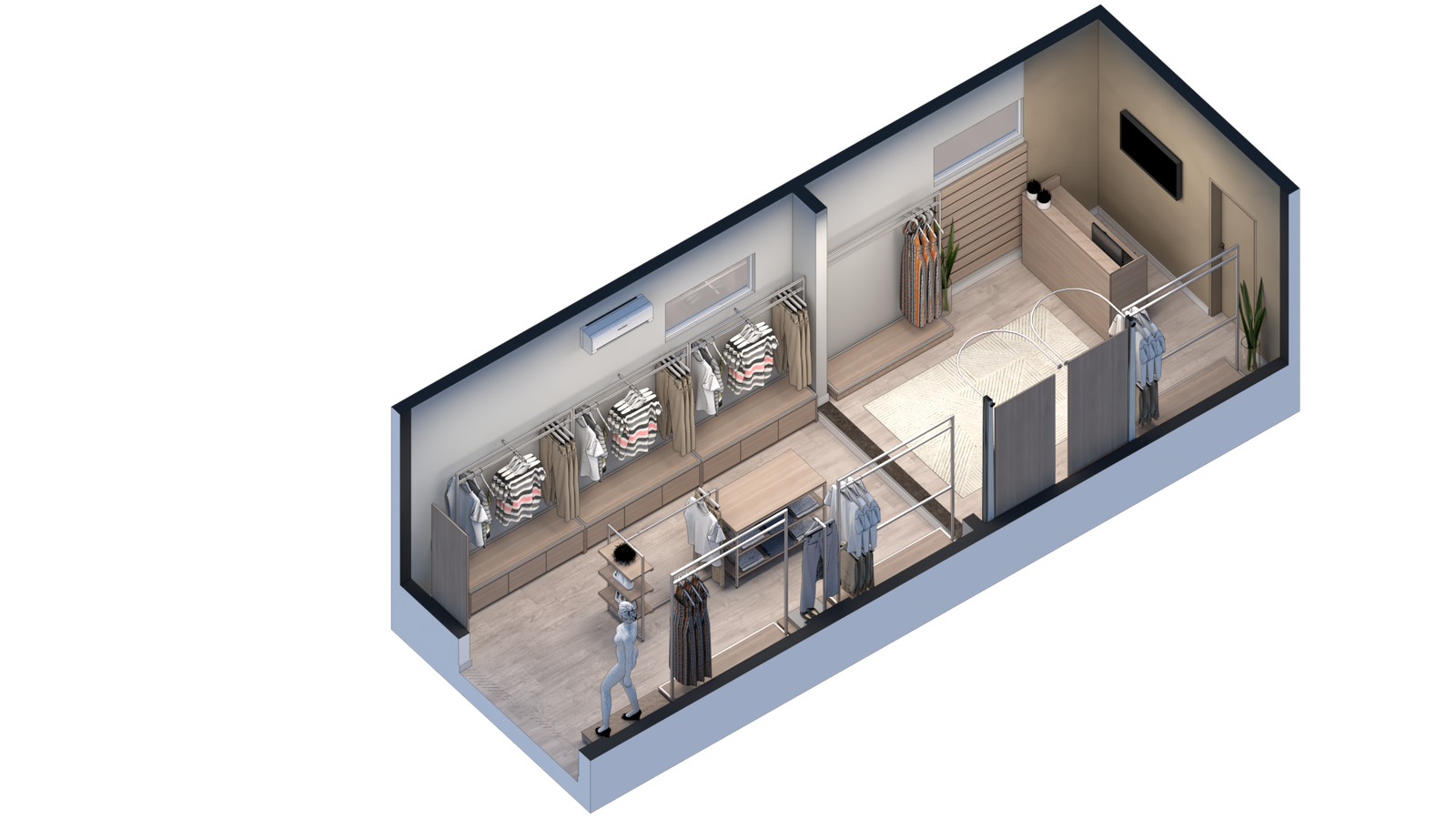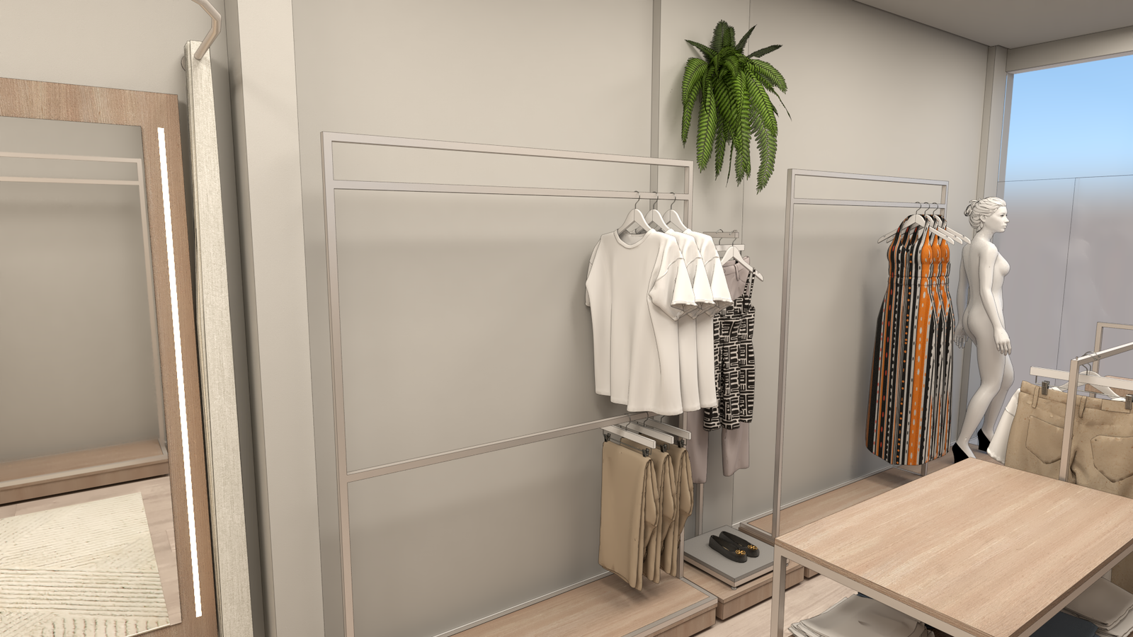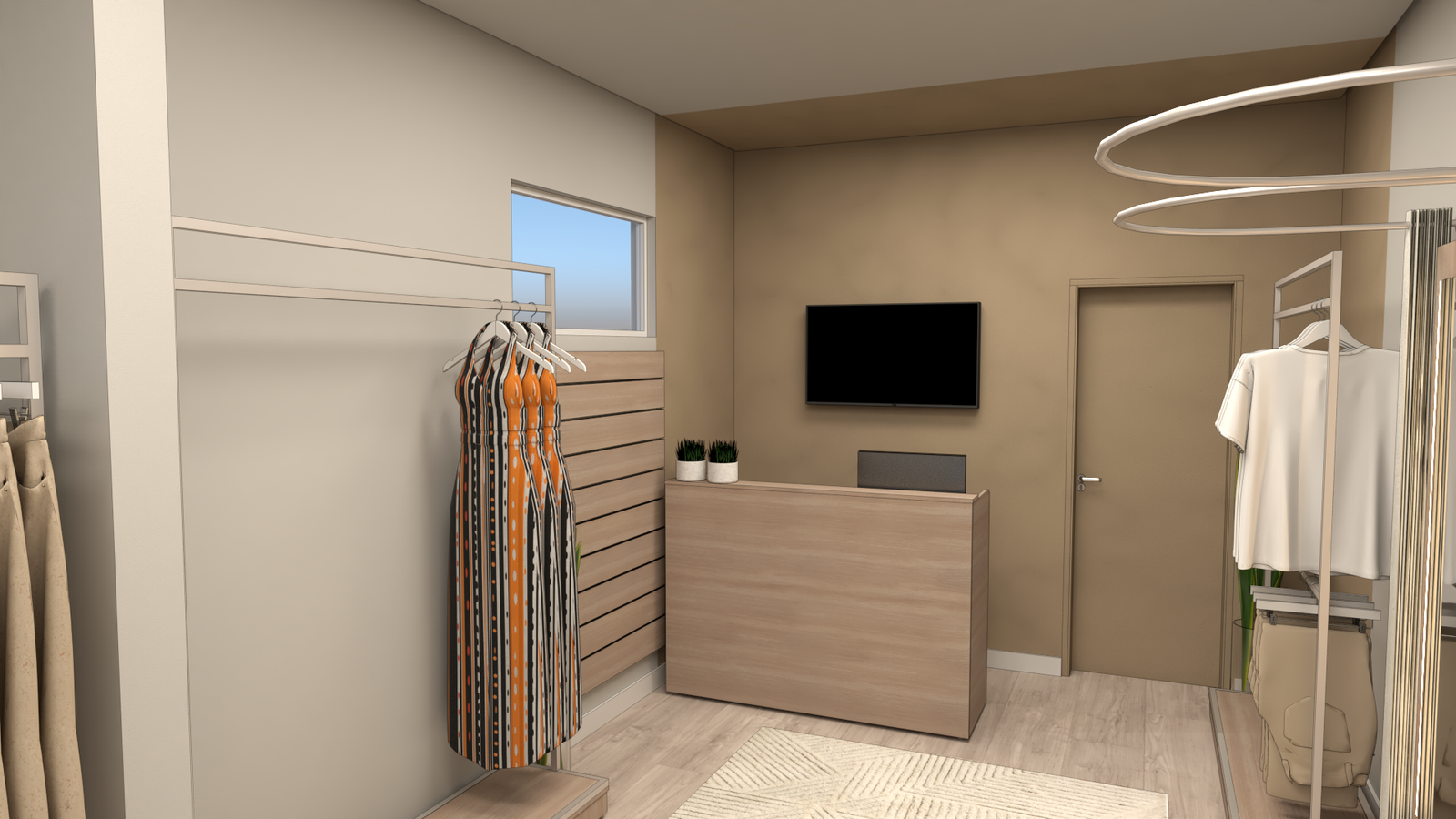Proposta de layout para showroom compacto da marca Donna, especializado em moda feminina. O espaço reduzido foi otimizado com mobiliário leve e funcional, que garante boa circulação e valorização das peças em exposição.