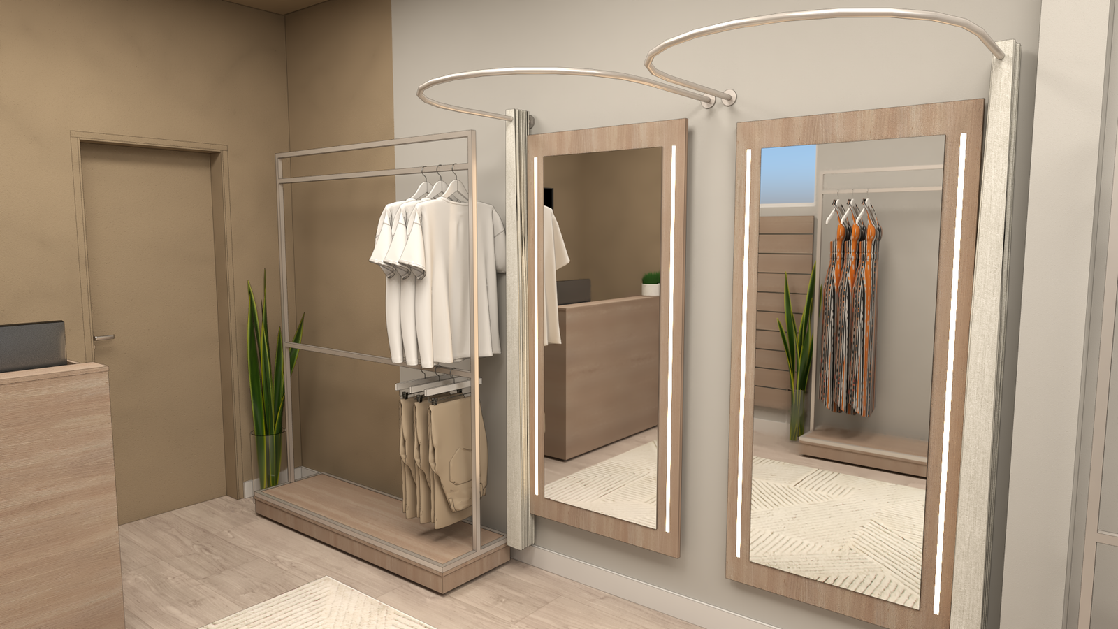 O projeto inclui araras de parede com base em marcenaria, nichos organizadores inferiores, provadores integrados com espelhos iluminados e mobiliário central para dobras e acessórios. A ambientação neutra e elegante reforça a identidade da marca e proporciona uma experiência acolhedora para atendimento personalizado.
