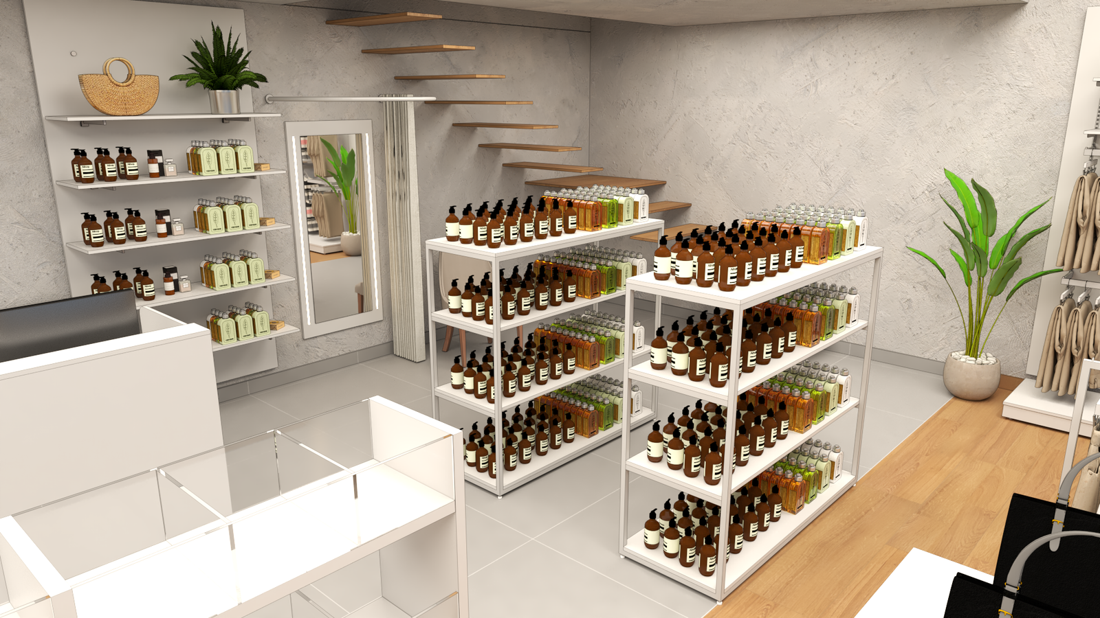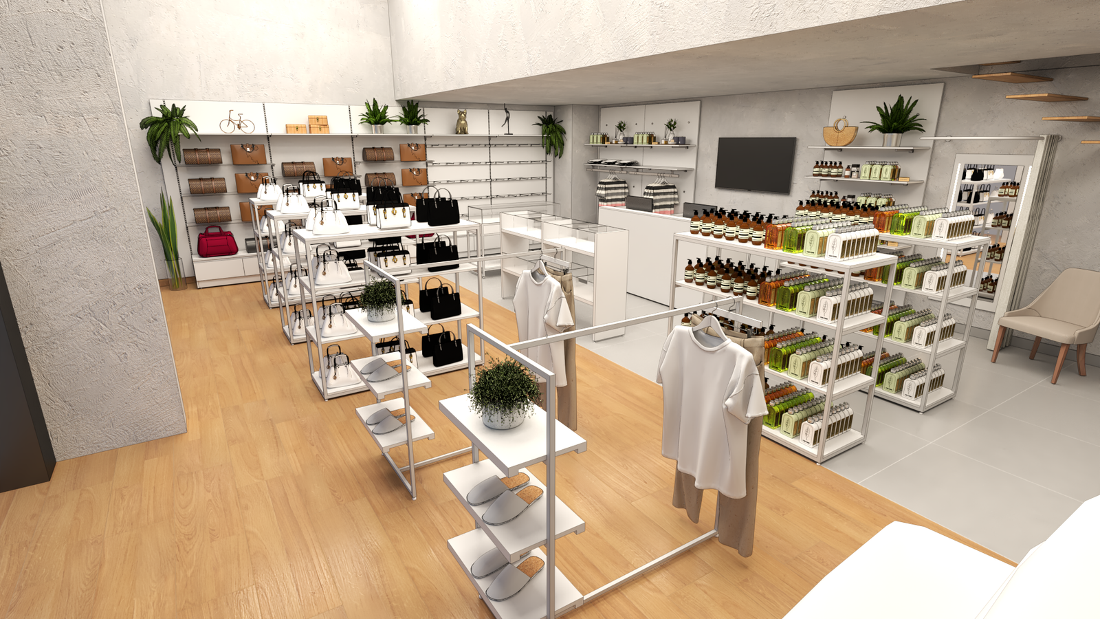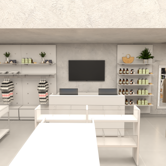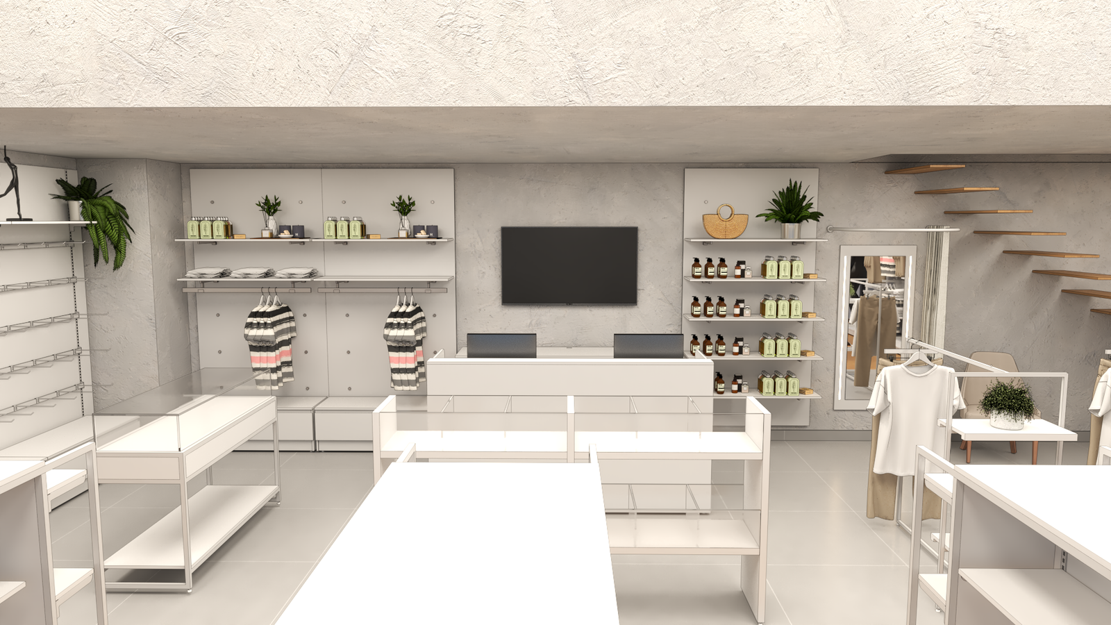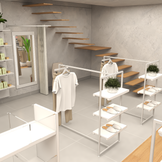 Desenvolvemos um layout funcional para a loja Maria Mari, buscando equilíbrio entre exposição de bolsas, vestuário e cosméticos. A ambientação valoriza acabamentos neutros e mobiliário metálico branco, com destaque para a escada vazada em madeira e o espelho vertical de provador. A organização propõe divisão clara por categorias e boa visibilidade dos produtos, otimizando o fluxo dos clientes e reforçando a identidade sofisticada da marca.