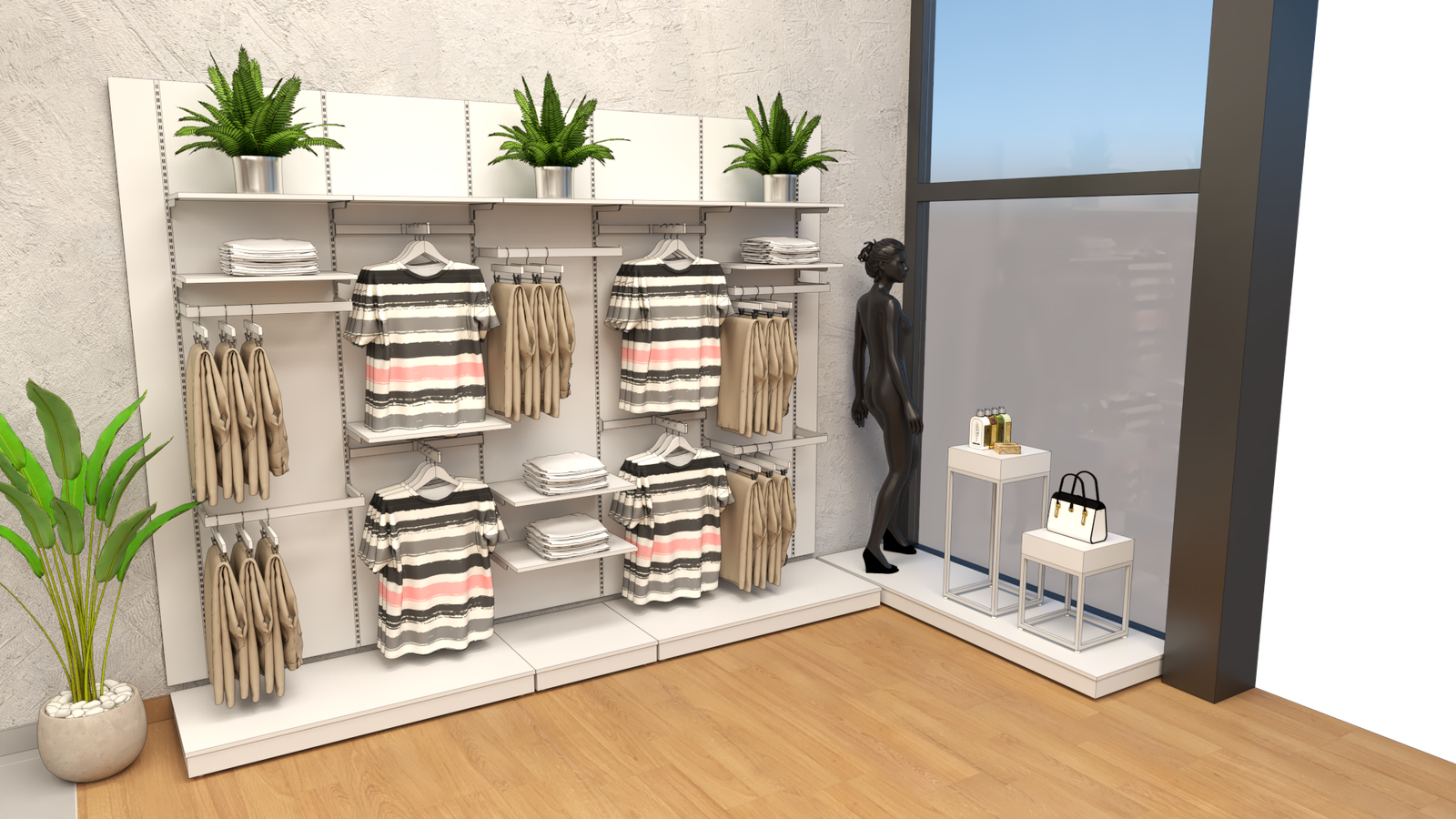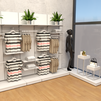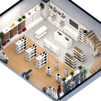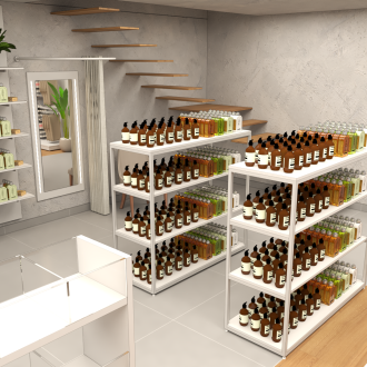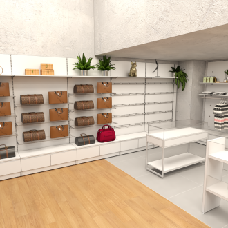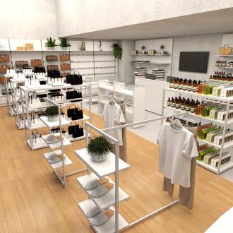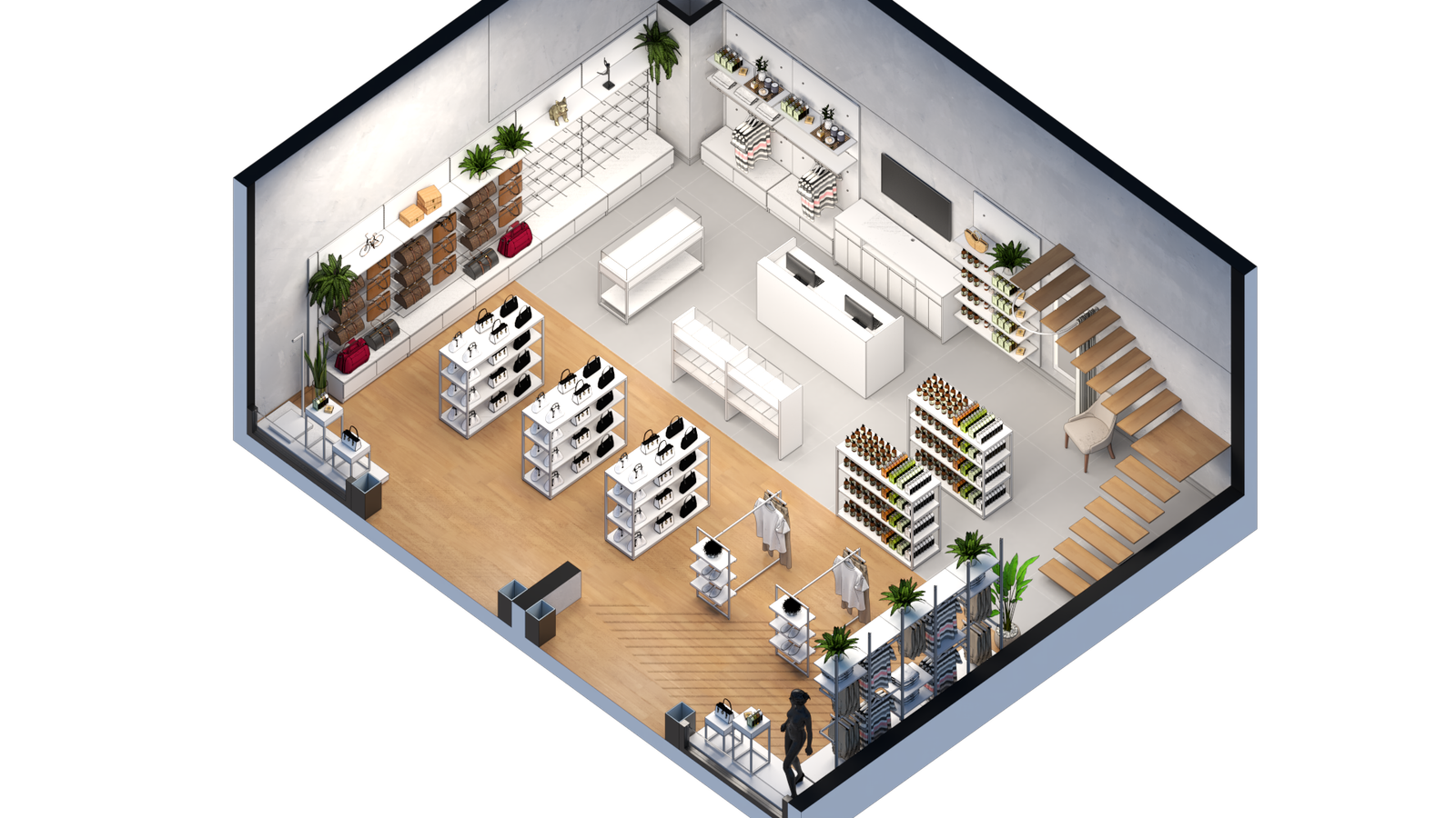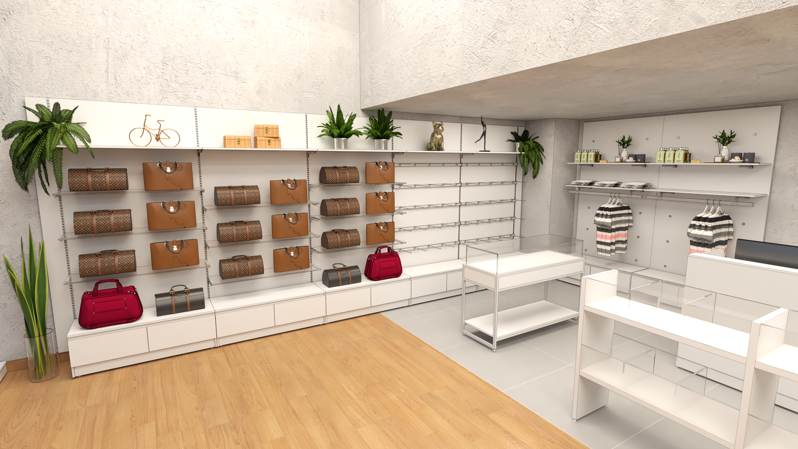 Desenvolvemos um layout funcional para a loja Maria Mari, buscando equilíbrio entre exposição de bolsas, vestuário e cosméticos. A ambientação valoriza acabamentos neutros e mobiliário metálico branco, com destaque para a escada vazada em madeira e o espelho vertical de provador. A organização propõe divisão clara por categorias e boa visibilidade dos produtos, otimizando o fluxo dos clientes e reforçando a identidade sofisticada da marca.