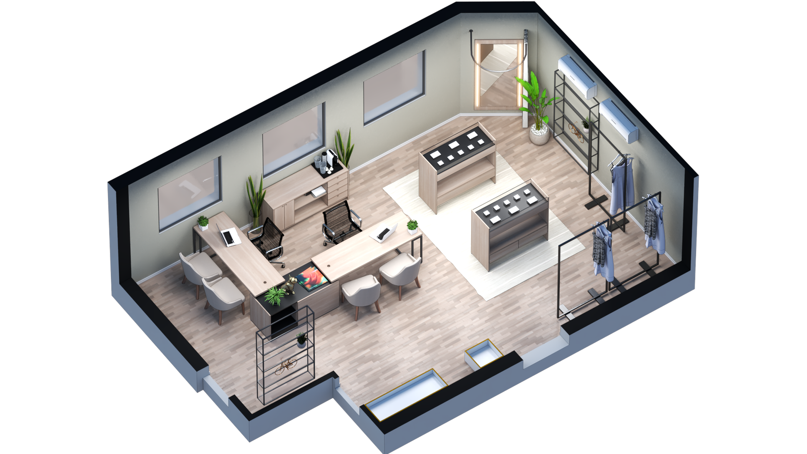 Desenvolvimento de layout exclusivo para showroom localizado na Rua Pedroso Alvarenga – SP, com foco na integração de duas frentes principais: alta moda feminina e semi joias. O espaço foi pensado para proporcionar uma experiência de compra fluida, elegante e funcional.