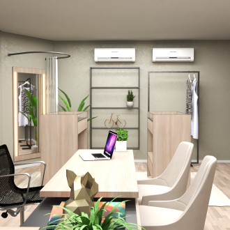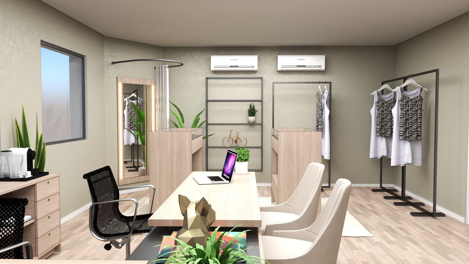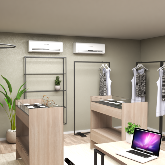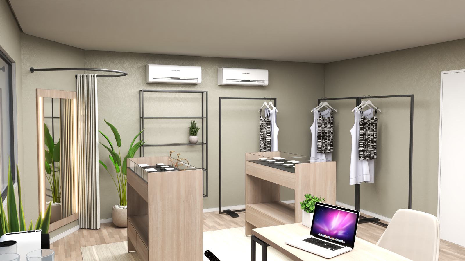 A proposta contempla o fornecimento completo de mobiliário sob medida, incluindo estações de trabalho, araras aéreas e de piso, nichos retroiluminados, ilhas expositoras centrais e painéis de parede com acabamento refinado. Cada elemento foi desenhado para valorizar os produtos expostos e reforçar a identidade visual da marca, mantendo o ambiente leve, sofisticado e convidativo.