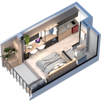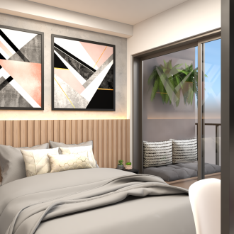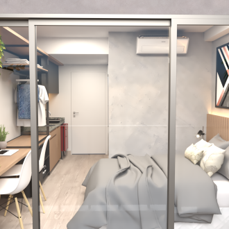 Desenvolvimento de layout compacto e funcional para studio residencial de 25m², com foco em praticidade e aproveitamento inteligente dos ambientes. A proposta inclui marcenaria sob medida integrada com estrutura metálica, bancada multifuncional para trabalho e refeições, armário aberto, cabeceira ripada com iluminação indireta, varanda com banco baú e painel de vegetação.